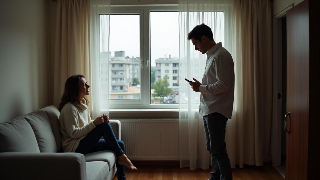 Tringa ishte mbledhur në cep të divanit në garsonieren e tyre me qira, me gjunjët e tërhequr pranë gjoksit. Përtej dritares shtrihej një lagje gri: pallate identike si kuti, makina të parkuara kudo, një pamje që të rëndonte frymëmarrjen.