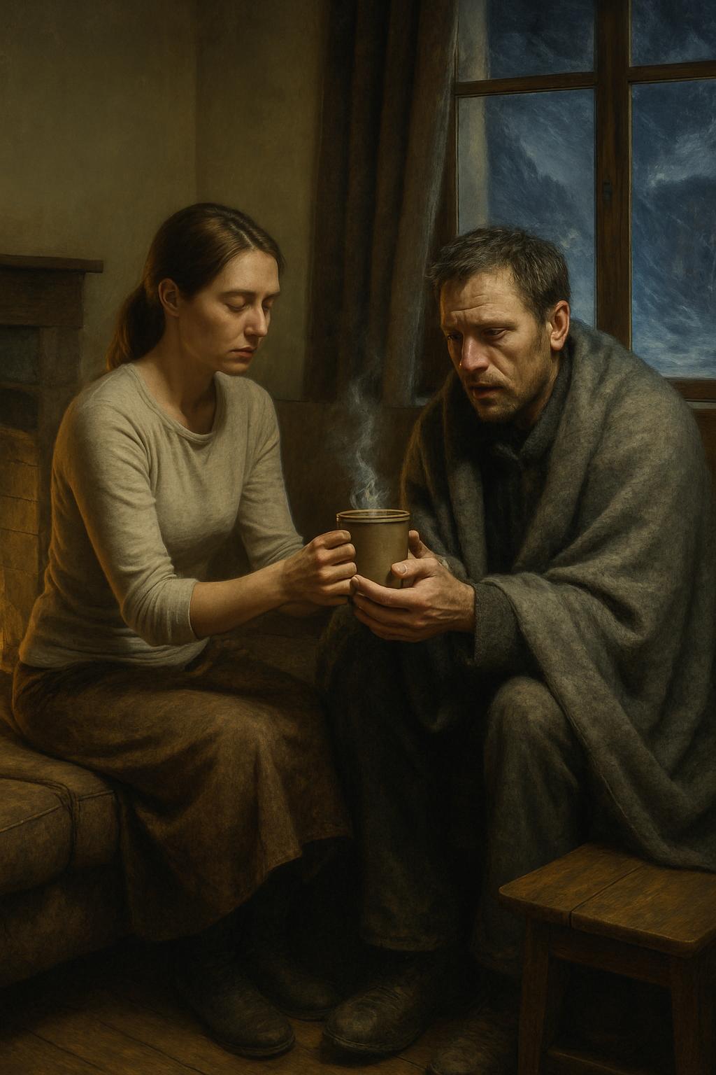 Burri e piu me etje pijen e nxehtë dhe dridhja nisi t’i qetësohej dalëngadalë. Majlinda e vështroi me kujdes: dukej rreth të dyzetave, por rrudhat e thella dhe thinjat në tëmtha tregonin se jeta nuk kishte qenë e butë me të. Sytë e errët mbanin një lodhje të rëndë dhe një trishtim të fshehur.