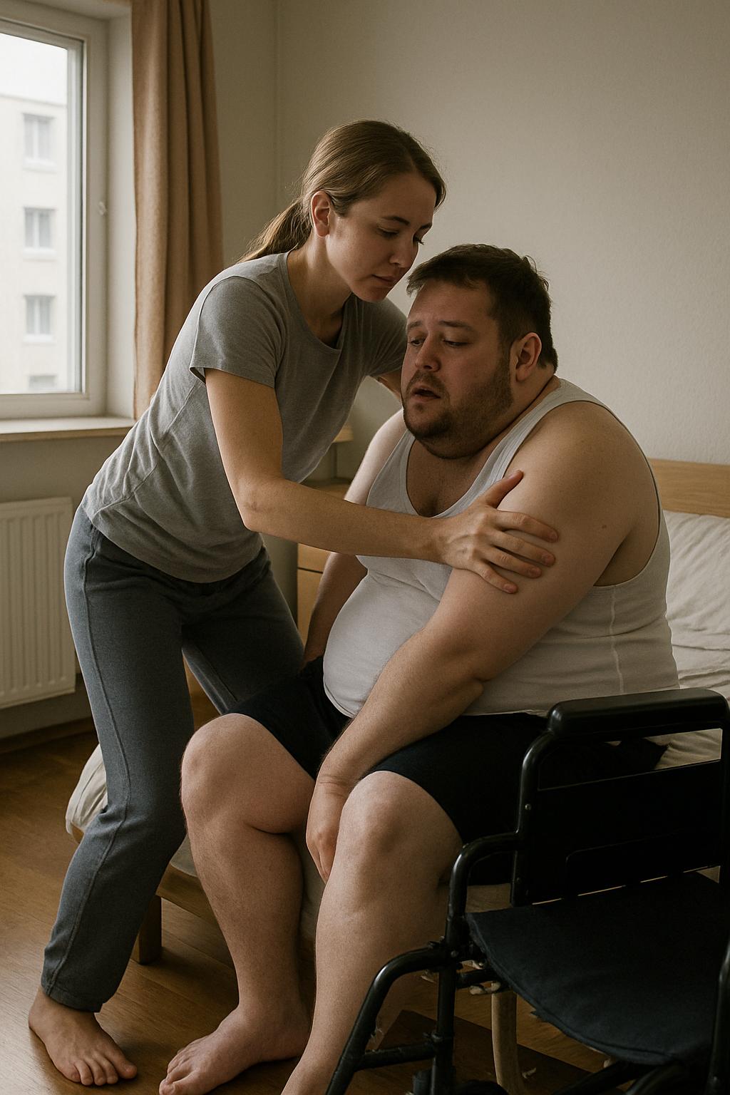 Ajo futi duart poshtë shpinës së tij dhe, me lëvizje të ngadalta e të studiuara, e rrotulloi në krah. Pas kësaj duhej t’i zbriste këmbët nga krevati i ulët, ta ndihmonte të ulej dhe më pas të përballej me pjesën më të vështirë: transferimin në karrocën me rrota.